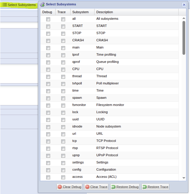 Currently, this involves entering a list of comma separated subsystems into a free-form text box. The contents of this text box are sent to TVH via the ‘/api/tvhlog/config/save’ API call.
