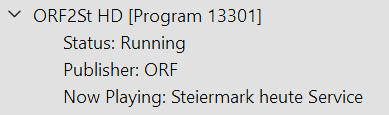 2025-10-13 19:22:19.118 subscription: 0008: "192.168.1.56 [ | Kodi Media Center ]" subscribing on channel "ORF2K HD", weight: 100, adapter: "M4 #5 : DVB-S #0", network: "Astra 19.2E", mux: "11273.25H", provider: "ORF", service: "ORF2K HD", profile="htsp", hostname="192.168.1.56", username="192.168.1.56", client="Kodi Media Center"